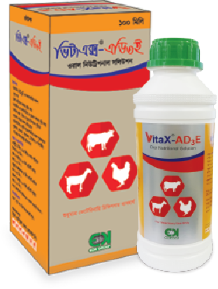 VitaX-AD3E Solution Balanced formula for healthy life ভিটা এক্স-এডি৩ই সলিউশন উপাদান: প্রতি মিলিতে আছে- ভিটামিন এ ১,০০,০০০ আই.ইউ, ভিটামিন ডি- ২০,০০০ আই.ইউ, ভিটামিন ই- ২০ মিগ্রা নির্দেশনা: ভিটামিন এডি,ই এর অভাবজনিত লক্ষণ প্রতিরোধ করে; রোগ প্রতিরোধ ক্ষমতা বৃদ্ধি করে; ভ্যাকসিনের কার্যকারিতা ও প্রজনন ক্ষমতা বৃদ্ধি করে; দৈহিক ওজন; ডিম ও দুধের উৎপাদন বৃদ্ধিতে; যেকোন ধরনের ধকল প্রতিরোধে; ব্যাকটেরিয়া ও কৃমি সংক্রমণজনিত ধকল পুনরুদ্ধারে; দূর্বলতা, অবসাদ, ক্ষুধামন্দা, রিকেট্স ও বিপাকীয় সংক্রান্ত সমস্যাসমূহ প্রতিরোধে বিশেষ ভূমিকা পালন করে। প্রয়োগমাত্রা: পোল্ট্রি: ১ মিলি/৩-৪ লিটার খাবার পানিতে মিশিয়ে ৩-৫ দিন। গরু ও ঘোড়া: ৫-১০ মিলি প্রতিটি প্রাণির জন্য ২-৩ দিন। বাছুর ও অশ্বশাবক: ৫ মিলি প্রতিটি প্রাণির জন্য ২-৩ দিন। ছাগল ও ভেড়া: ২-৩ মিলি প্রতিটি প্রাণির জন্য ২-৩ দিন।