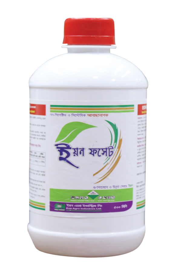 ইয়ন ফসেট ৪৮০ এসএল কার্যকরী উপাদান: গ্লাইফসেট ৪৮% বালাইনাশকের ধরণ: আগাছানাশক কার্যকারিতার ধরণ: ননসিলেক্টিভ, সিস্টেমিক, আগাছা গজানোর পরে ব্যবহারযোগ্য ব্যবহারের ক্ষেত্র ও মাত্রা: ফসল ক্ষতিকর আগাছা প্রতি ১৬ লিটার পানিতে মাত্রা চা সব ধরণের বর্ষজীবি ও বহুবর্ষজীবি আগাছা ১২০ মিলি ব্যবহারের নিয়ম: ইয়ন ফসেট ননসিলেকটিভ আগাছানাশক যা চা, রাবার, আম, পেয়ারা, লেবু, কলা, কুল সহ অন্যান্য বড় ফল বাগানে এবং কাঠ উৎপাদনকারী বাগানে সব ধরনের আগাছা নিধনে অত্যন্ত কার্যকরী ইয়ন ফসেট – উজ্জল সূর্যালোকে ব্যবহার করলে সবচেয়ে ভাল ফল পাওয়া যায় ইয়ন ফসেট আগাছা বিস্তার অনুযায়ী অনুমোদিত মাত্রায় ১-১.৫ মাস পর পর ব্যবহার করা যেতে পারে ইয়ন ফসেট এর সাথে লবণ মিশিয়ে (১৬ লিটারে ১৫০ গ্রাম) স্প্রে করলে আরো বেশি ভাল ফল পাওয়া যায় ইয়ন ফসেট কোন ভাবেই যেন মূল ফসলে না পড়ে সেদিকে খেয়াল রাখতে হবে। সাবধানতা: অন্য কোন বালইনাশক ইয়ন ফসেট এর সাথে মিশানো যাবে না। ছিটানোর পর স্প্রে মেশিন অবশ্যই ভালোভাবে ধুয়ে রাখতে হবে। প্রতি একরে মাত্রা: ১.৫ লিটার, প্রতি হেক্টরে মাত্রা: ৩.৭ লিটার। ব্যবহারের আগে লেবেলে উল্লেখিত ব্যবহারবিধি ও সাবধানতা অনুসরণ করুন প্যাক সাইজ: ৫০০ মিলি ও ১ লিটার।