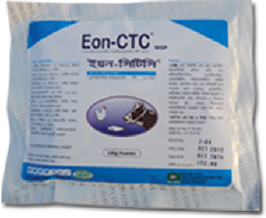 Eon-CTCP Powder ইয়ন-সিটিসি পাউডার The Broad Spectrum Antibiotic উপাদান: নির্দেশনা: প্রয়োগমাত্রা: ক্লোরটেট্রাসাইক্লিন ২০% গ্রাম পজিটিভ ও নেগেটিভব্যাকটেরিয়াল আক্রমণ প্রতিরোধ করে। চিকিৎসায়: ৫০ গ্রাম/ ৭৫ লিটার পানিতে মিশিয়ে ৫-৭ দিন অথবা ৭৫-১০০ গ্রাম/ ১০০ কেজি খাদ্যের সাথে মিশিয়ে ৫-৭ দিন প্রতিরোধে: ৪০ গ্রাম/ ১০০ কেজি খাদ্যের সাথে মিশিয়ে নিয়মিত খাওয়াতে হবে। মাইকোপ্লাজমোসিস এর জন্য: ১১০-৩০০ মিগ্রা/ কেজি দৈহিক ওজন হিসেবে অথবা ১-৩ গ্রাম/কেজি পানির সাথে মিশিয়ে ৫-৭ দিন